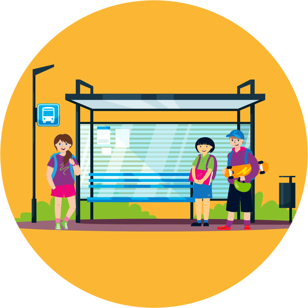 Wait quietly and in line at the bus stop, away from the road. When you get off a bus, wait for it to leave the bus stop before crossing the road.