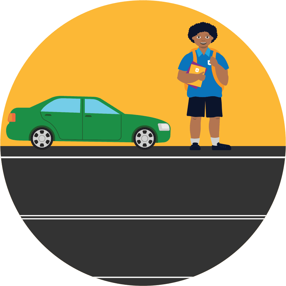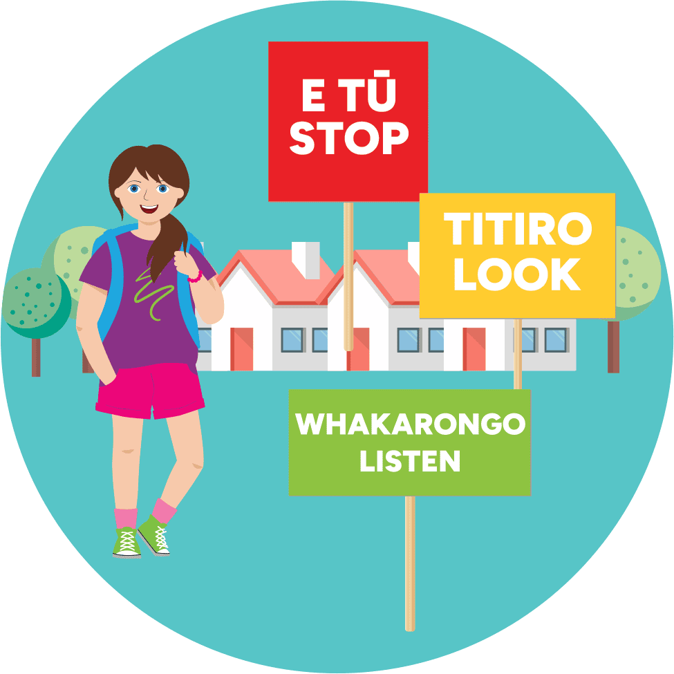 Stop, Look, Listen (E tū, Titiro, Whakarongo) before crossing a road or driveway.