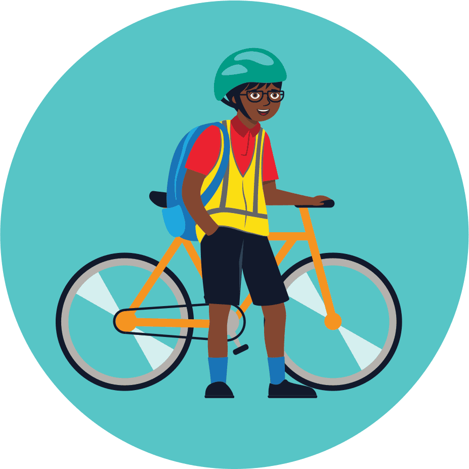 Always wear a securely fastened helmet when cycling or scootering. Wear bright clothes or a hi-vis vest so that other road users can see you.