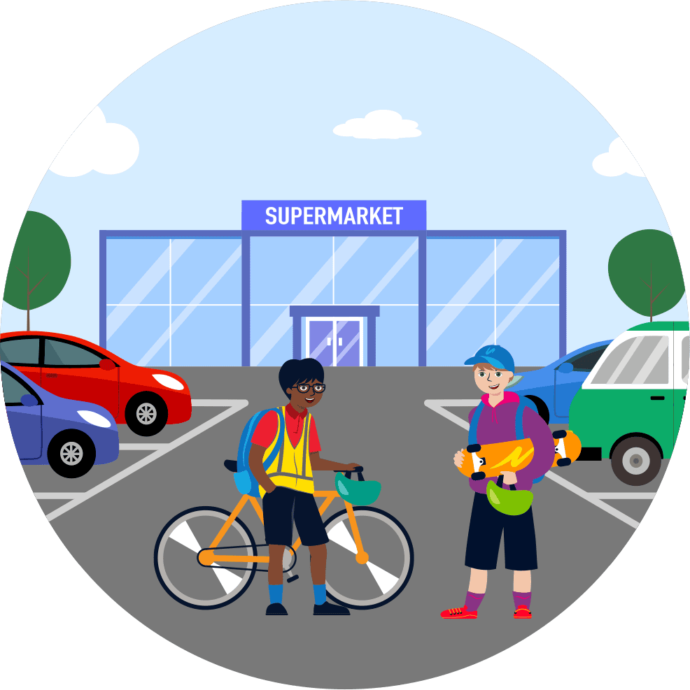 Car parks can be busy and dangerous so best to avoid them. Walk your bike or scooter in car parks and watch out for reversing lights.