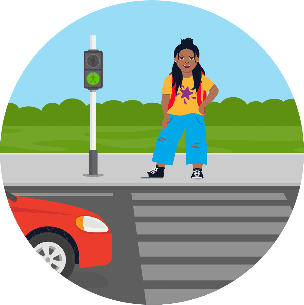 Only cross when you see the green man is lit and always check that the traffic has stopped before you cross the road.